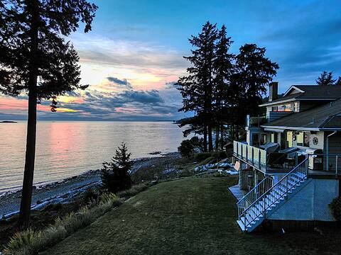 Nestled in a serene location on nearly half an acre of parklike property, this stunning 5-bed, 4-bath home—with a bonus room - offers the perfect blend of comfort and style. As you step inside, you're greeted by a living room with French doors leading to a sunny outdoor space. Upstairs, a vaulted ceiling enhances the open-plan family room, dining area, and beautifully updated kitchen, which features two ovens, a built-in espresso machine, and a wine bar—a dream for entertaining. The spacious primary suite has direct access to a deck with a hot tub for ultimate relaxation. The property also boasts a double and a single-car garage with heated floors which extend throughout the main level. There is also a workshop with a powder room and plenty of space for easy suite options. R3 Zoning